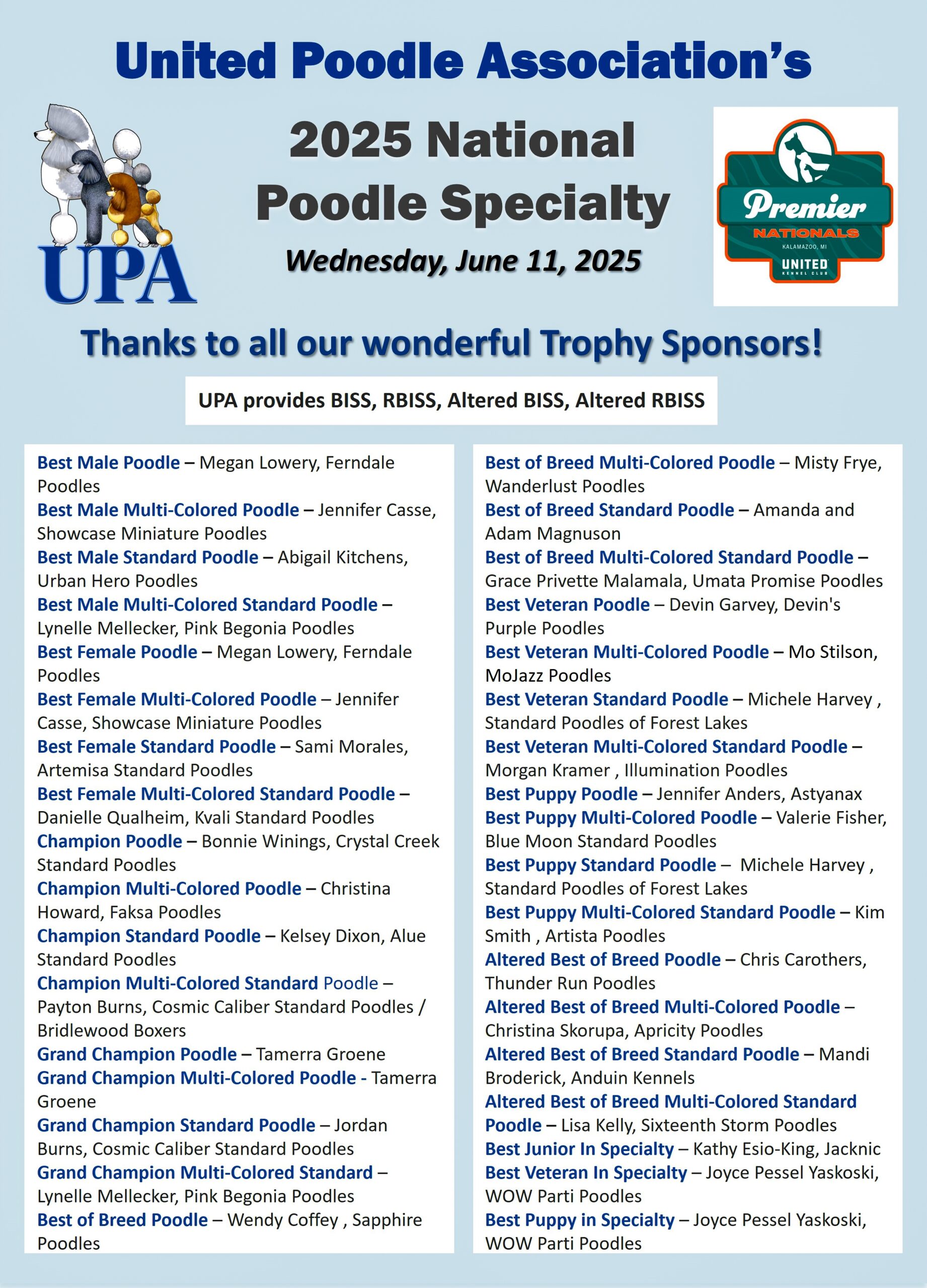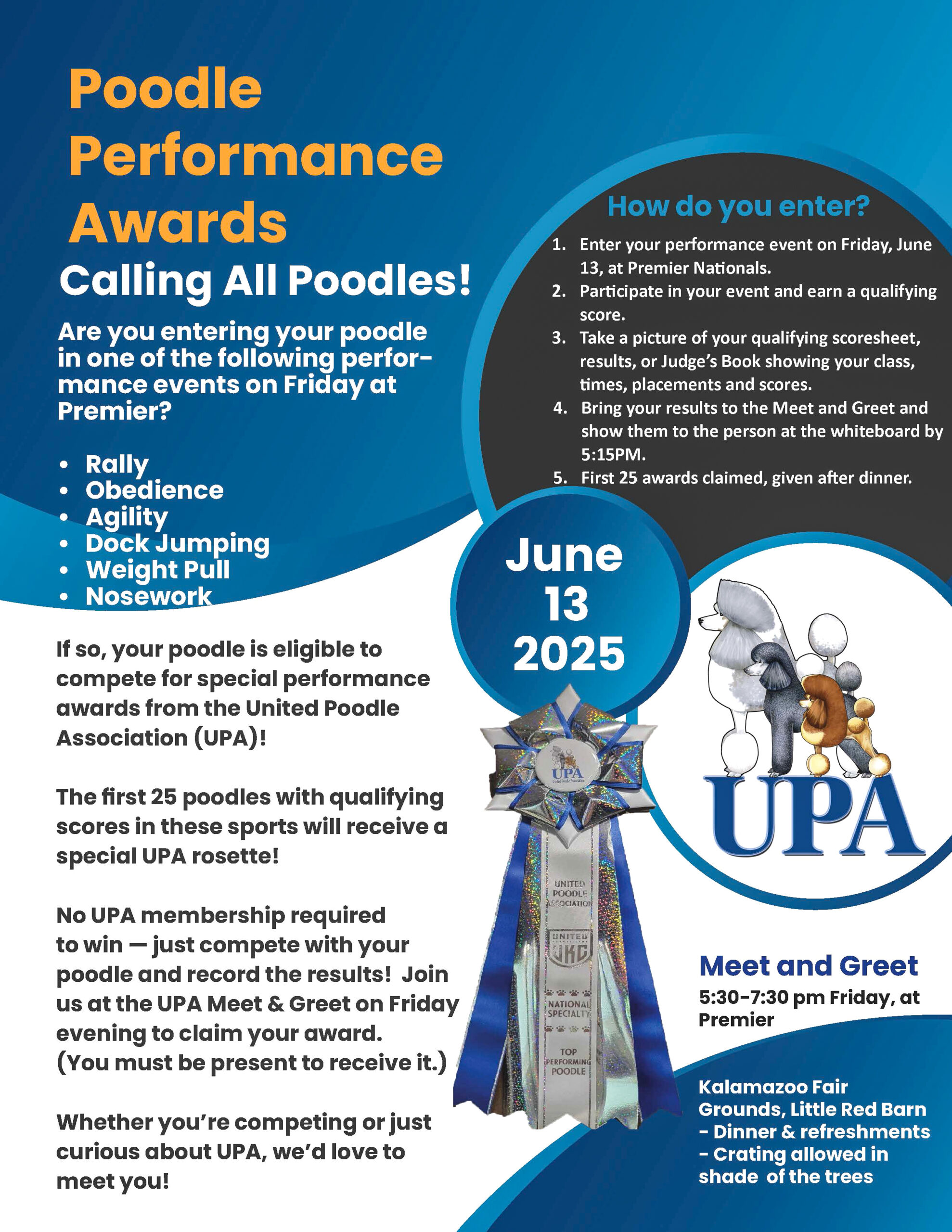 Pre-entry Deadline: Entries open April 21st and pre-entries for the UPA Poodle Specialty must be received by May 19th, 2025. We also accept day of show entries.